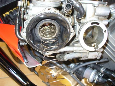 Venerdì 1 Maggio 09 . Ho finito il rodaggio! La moto va decisamente bene, ho deciso di cambiare il pignone della trasmissione secondaria mettendone uno da 17 al posto del 16 denti. In questa maniera potrò alzare la velocità di crociera. Cambio l'olio motore con del Bardhal XTC C60 15W-50 ed il relativo filtro. Controllo le valvole e diminuisco il gioco (le avevo lasciate più aperte per il rodaggio). Ora è il turno della carburazione. In effetti le candele hanno un colore un po' chiaro. Ho comprato il Kit Dynojet per la mia moto..