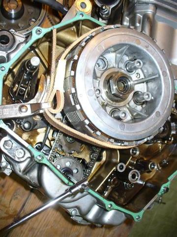 Ora è il turno della catena di servizio.. utilizzo una chiave a nastro per far tenuta sulla campana frizione (solo messa in sede e non avvitata) e agevolarmi così lo svitamento della coroncina..
